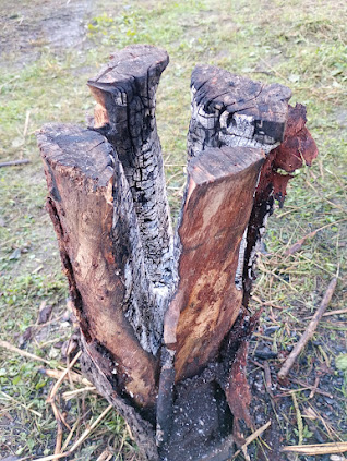 友人のところで焚火を楽しむ会が開催されたので、遊びに行ってきました! 夜の写真を撮っておけばよかったのですが、楽しい夜はお喋りに花が咲いて撮り忘れ💦 朝になって、燃え残りのスウェーデントーチをとりました。 スウェーデントーチとは丸太...
