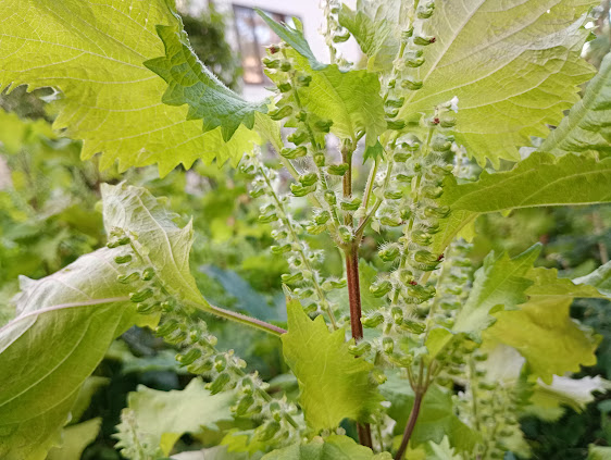 紫蘇の実がそろそろ取り頃となりました。 穂になっている紫蘇の花のうち、上の方ひとつふたつだけ咲き残っている頃が取り頃らしい。 紫蘇の実を開いてみると、中にまだ白い紫蘇の種子が入っていました。 この種子が黒くなってくると硬くなって口当たりが悪... -